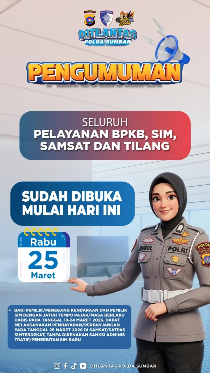Padang — Direktorat Lalu Lintas (Ditlantas) Polda Sumatera Barat resmi mengumumkan bahwa seluruh layanan administrasi kendaraan dan pengemudi kembali dibuka mulai Rabu, 25 Maret 2026.
