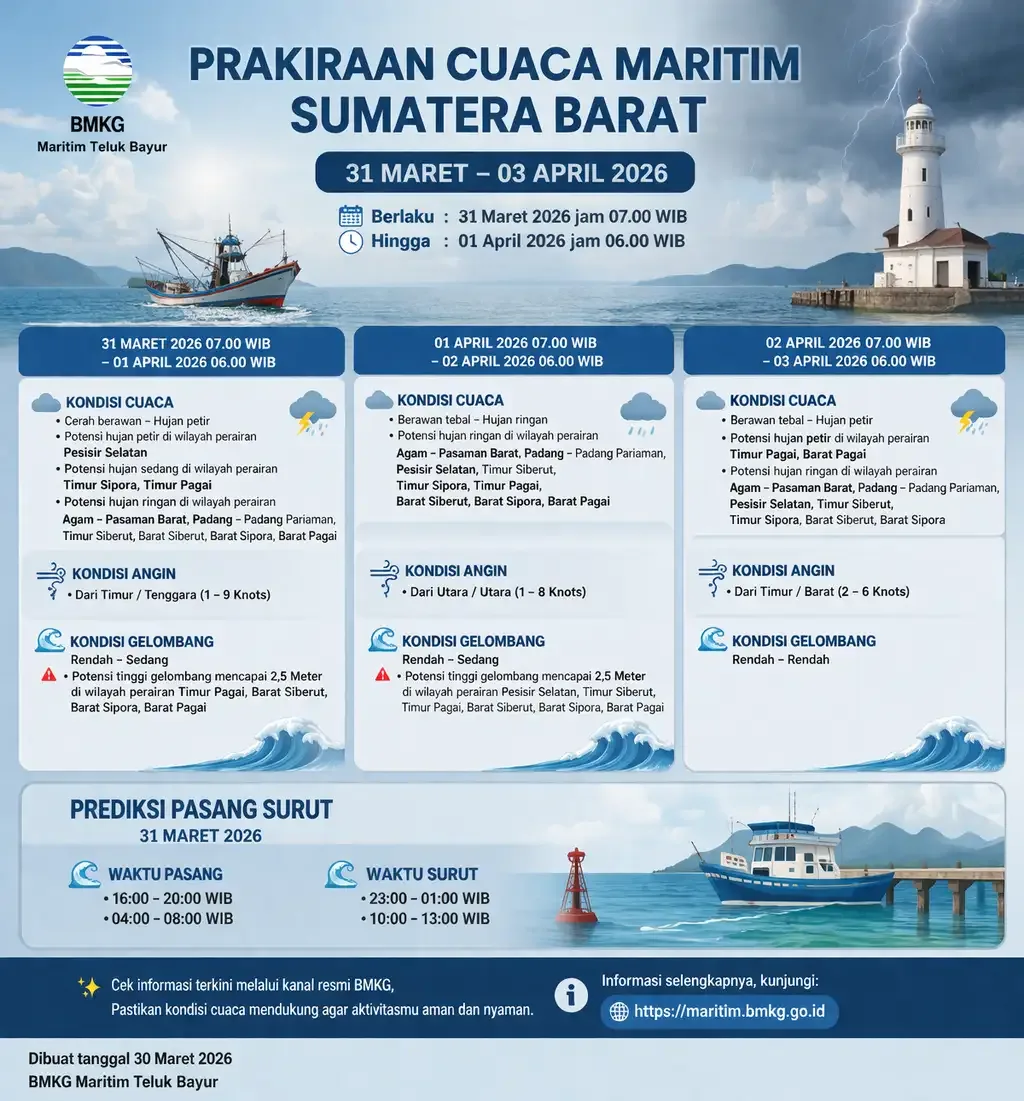 Pada periode 31 Maret 2026 pukul 07.00 WIB hingga 1 April 2026 pukul 06.00 WIB, kondisi cuaca diprakirakan bervariasi dari cerah berawan hingga hujan petir. Potensi hujan petir diperkirakan terjadi di perairan Pesisir Selatan. Sementara itu, hujan dengan intensitas sedang berpotensi terjadi di wilayah perairan Timur Sipora dan Timur Pagai.